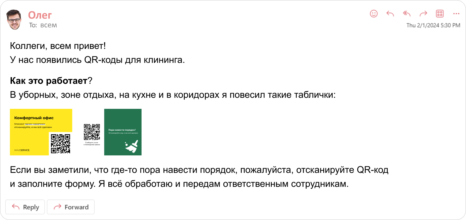 Олег всё так и сделал. Теперь сотрудникам не нужно ходить или звонить на вечно занятый телефон специалиста АХО, а QR-коды не вызвали удивления.