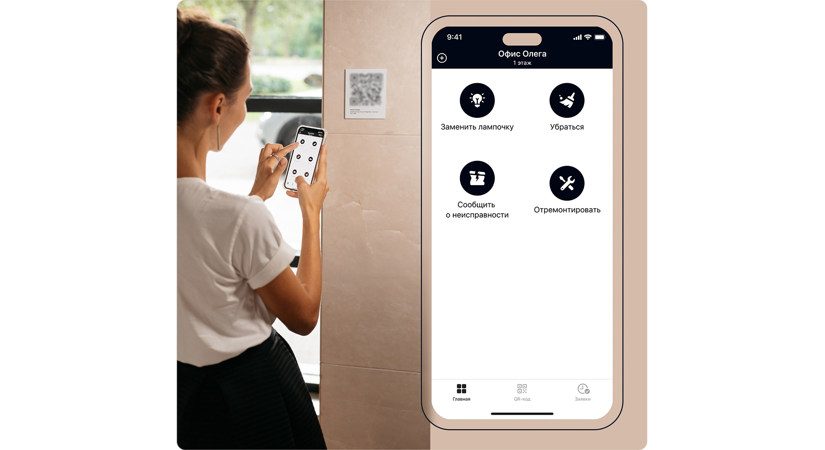 Когда сотрудник обнаруживает, что в помещении пыльно, грязно, кто-то что-то пролил, он сканирует QR-код и описывает ситуацию.