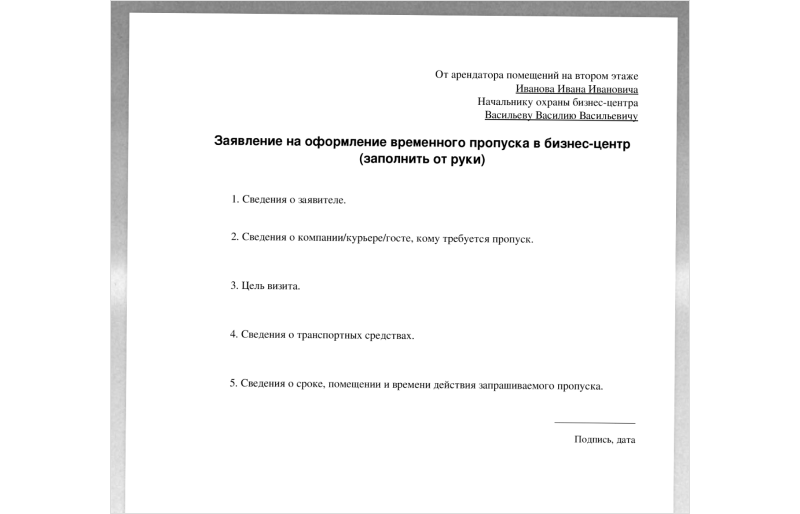 Заявление на разовый пропуск в бизнес-центр