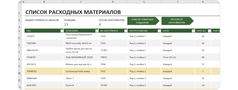 Учёт расходников в таблице Excel