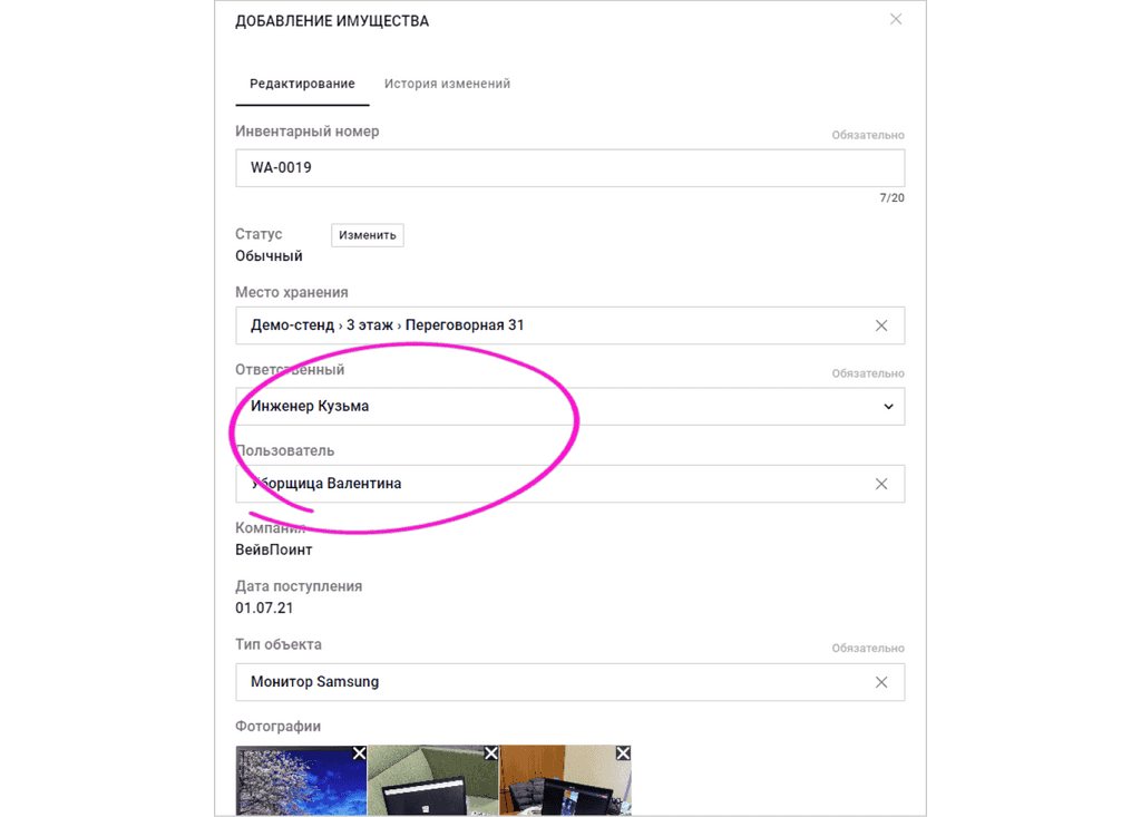 В системе за каждой ТМЦ закрепляется материально ответственное лицо. Передать ответственность за объект может только администратор или руководитель — для этого есть специальная роль.