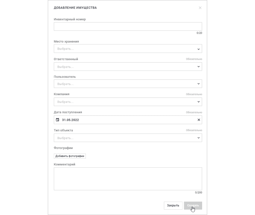 - Списан — объект списан по причинам, которые указываются в комментариях и подкрепляются актами.