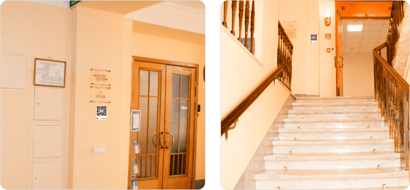 Ниже покажем примеры размещения QR-кодов в помещениях и на прилегающей территории. Выберите, что лучше подойдёт в вашей ситуации, если не получится, свяжитесь с нами — подскажем.