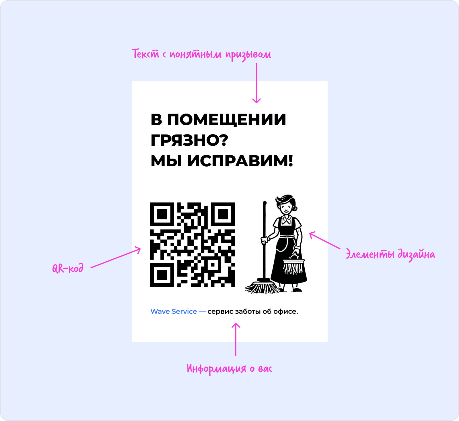 Если вы планируете повесить QR-код для сервисных заявок на уборку помещений, важно составить простой пояснительный текст на табличках. Так люди поймут, зачем в здании висит QR-код, и когда его использовать.