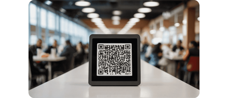 Пример размещения QR-кода в столовых - Сотрудник сканирует код и на экране появляется каталог услуг, где он может описать проблему.