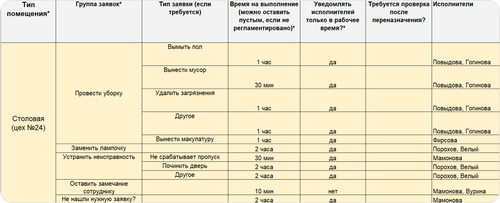 Обычно заполнение классификатора — это трудоёмкое упражнение для заказчика, потому что нужно внести все помещения, типы заявок, ответственных и установить SLA.