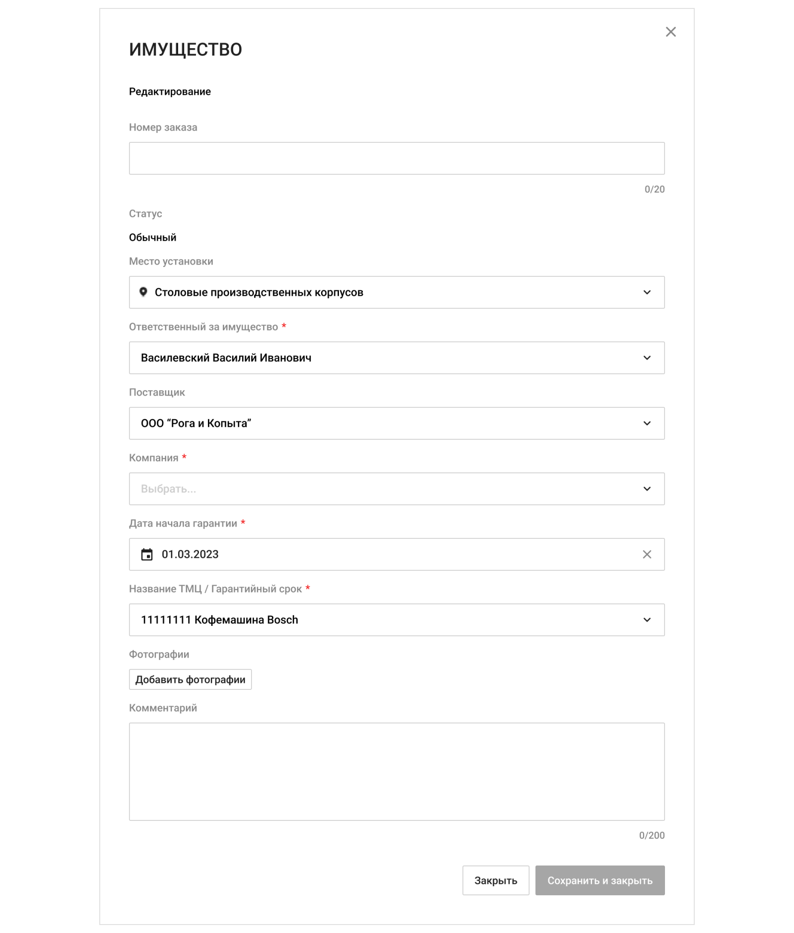 На старте по аналогии с реестром помещений загрузили в систему более 2 500 единиц ТМЦ. Когда список ТМЦ большой, мы сами подгружаем данные в систему. Если заказчику нужно в моменте добавить новые ТМЦ, он может это сделать самостоятельно. - Изменили название полей в карточке ТМЦ под нужды заказчика.