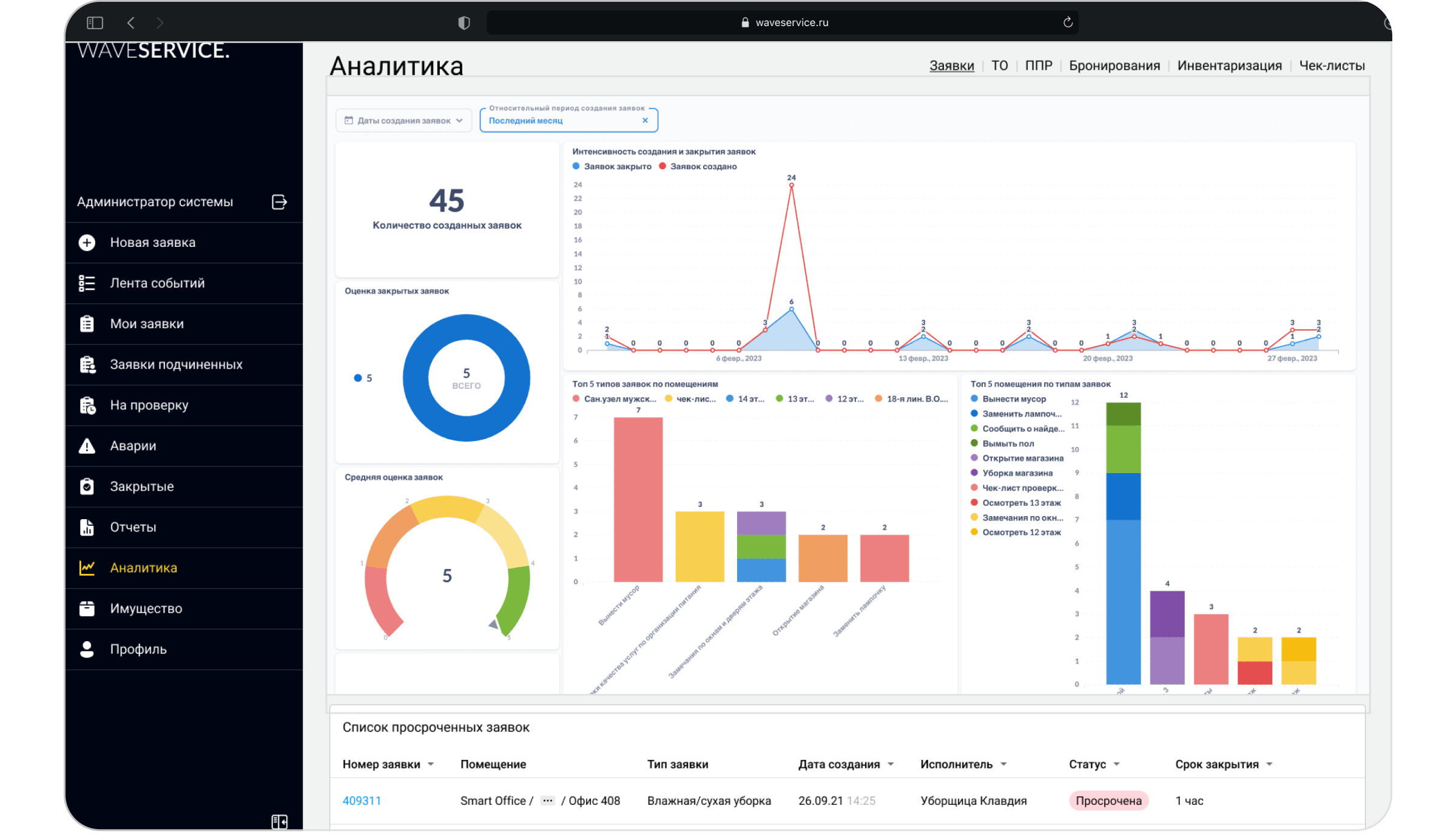 Выше при описании алгоритма работы сервисных заявок и обходов мы упоминали, что все данные попадают в отчёты и дашборды — это наш стандартный функционал работы системы.