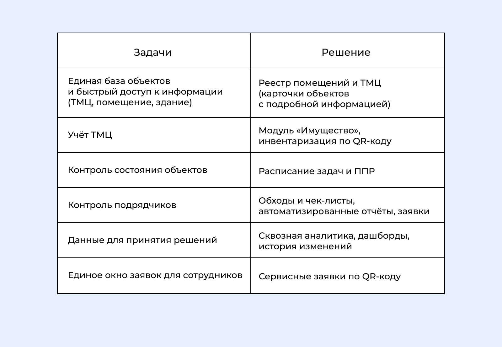 С заказчиком мы познакомились на профильном мероприятии для специалистов АХО. Для начала выявили потребности клиента и рассказали, как мы можем помочь без длительных доработок, так как скорость внедрения была крайне важна — программа ремонтов и улучшений условий труда была уже запущена.