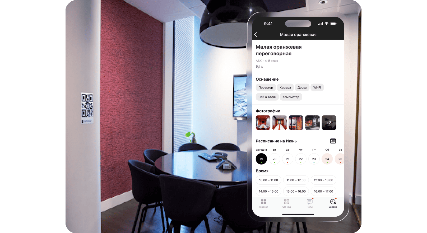 При использовании системы сотруднику по QR-коду, в браузере или мобильном приложении доступны все необходимые данные для бронирования: локация, свободное время, общая информация о переговорной. Ещё есть напоминания в виде push-уведомлений о начале бронирования.