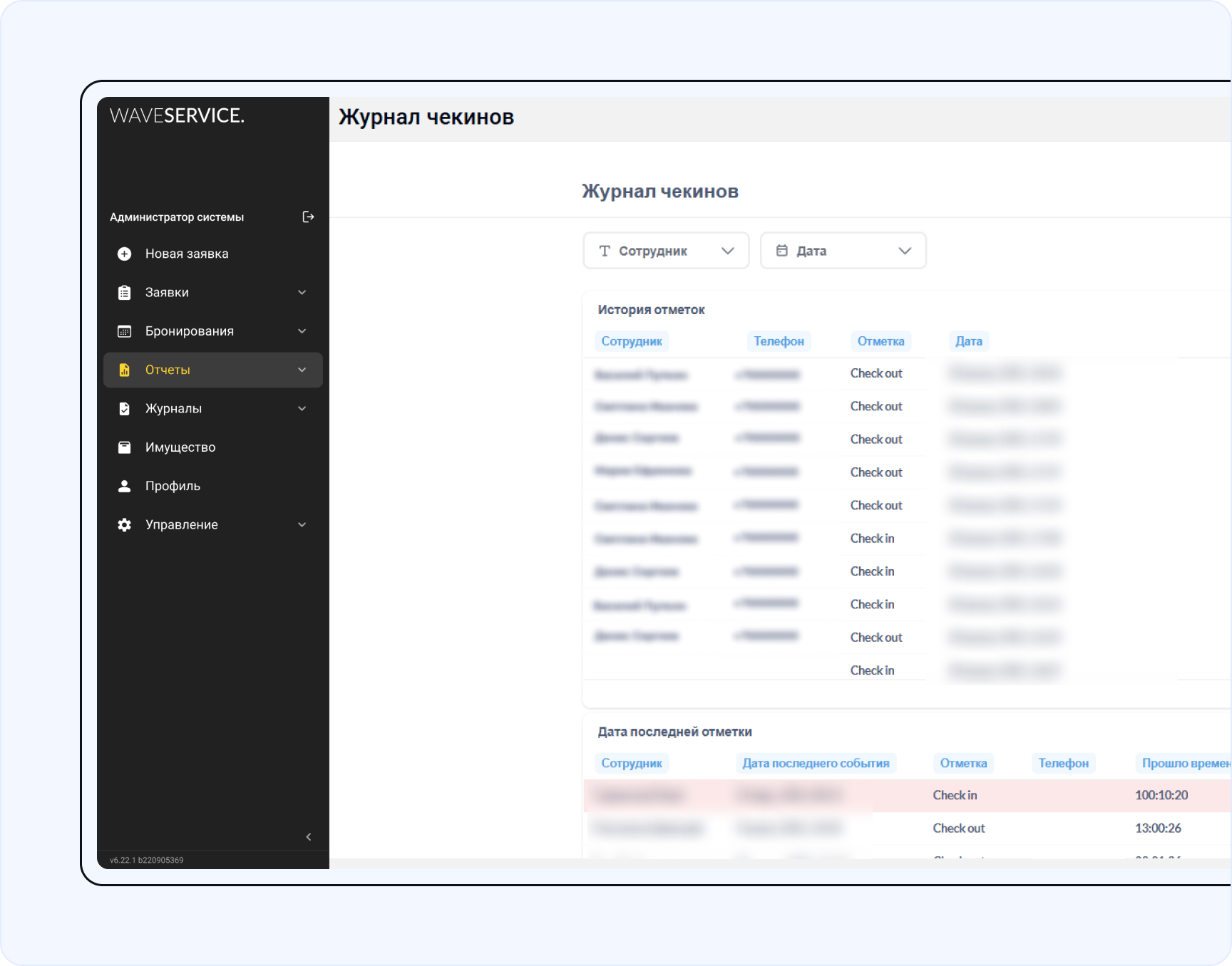 Отметки о входе и выходе из спортзала в мобильном приложении Wave Service - Система передаёт информацию в журнал отметок: ФИО, номер телефона, дата и время, отметка — вход или выход.