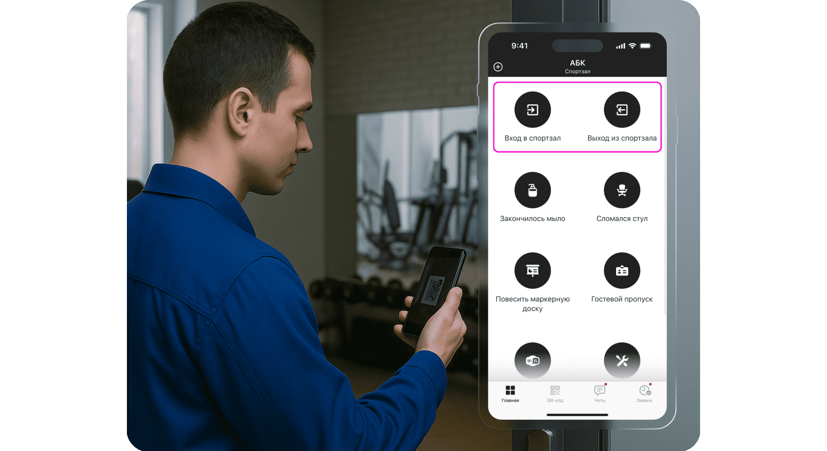 - На входе в спортзал сотрудник сканирует QR-код или прямо в мобильном приложении отмечает, что он зашёл на тренировку.