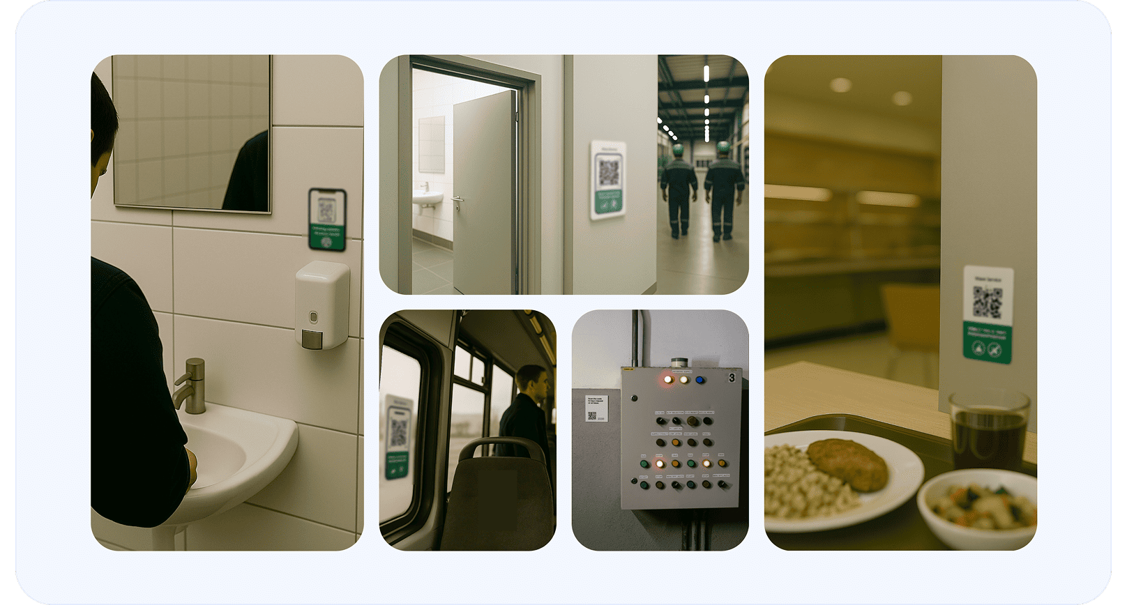 Так могут выглядеть таблички с QR-кодами. Реальные фото с площадки заказчика не публикуем по NDA, но логика размещения была похожей