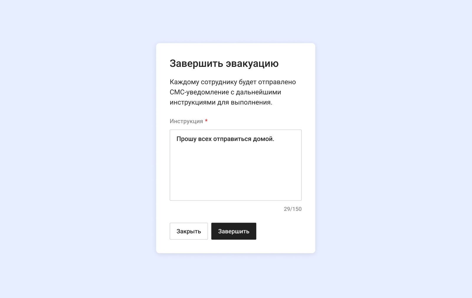 Когда эвакуация завершена, ответственный может через систему передать сотрудникам дальнейшие инструкции. Например, сообщить, можно ли отправиться домой или стоит дождаться дополнительных указаний, где можно укрыться от непогоды, когда и где будет возможно забрать личные вещи и т.д.