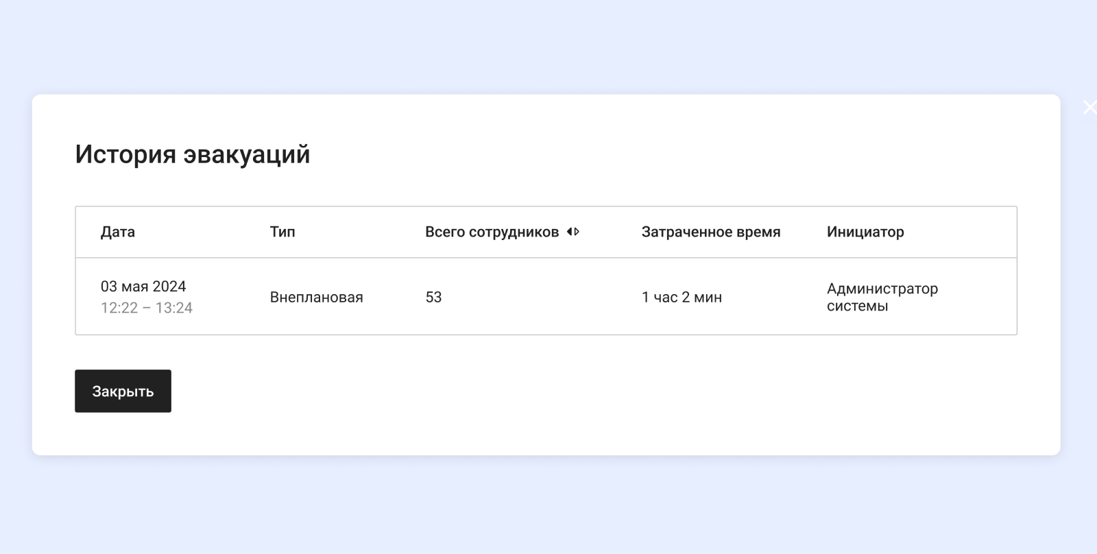 Все действия фиксируются в истории, а данные доступны для формирования отчётов по эвакуации и анализа процесса.