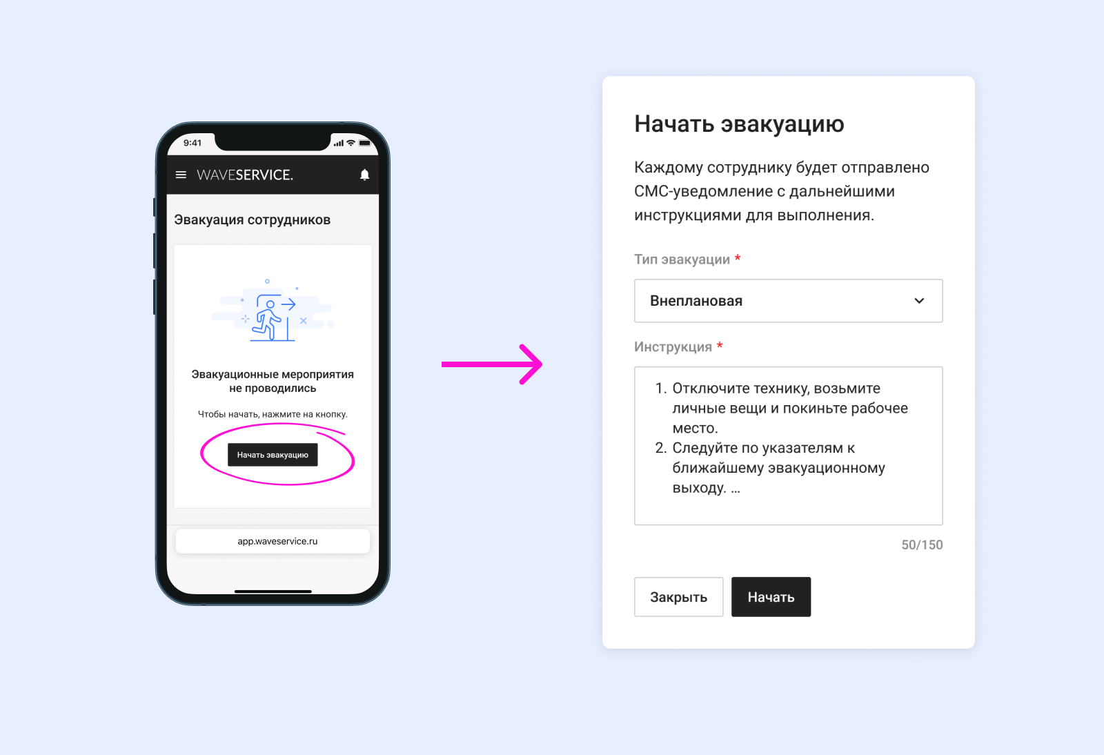 Если нужно провести эвакуацию, ответственный сотрудник может создать заявку в мобильном приложении или в веб-версии Wave Service — в зависимости от того, что удобнее в данный момент.