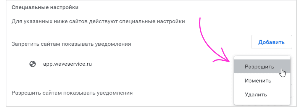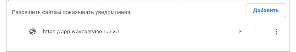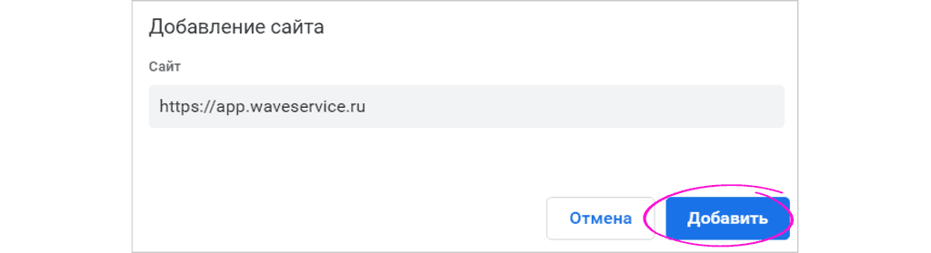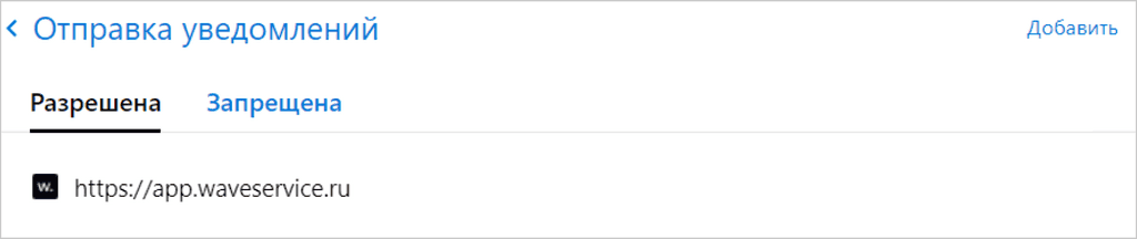 В разделе «Разрешить» нажмите на кнопку «Добавить». Скопируйте адрес https://app.waveservice.ru и вставьте в поле ввода. Снова нажмите «Добавить».