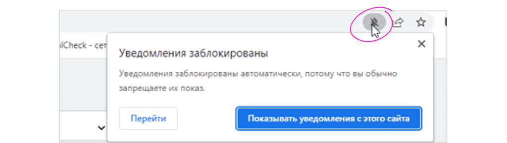 - Нажмите на значок колокольчика в правом углу адресной строки и выберите пункт «Показывать уведомления с этого сайта».