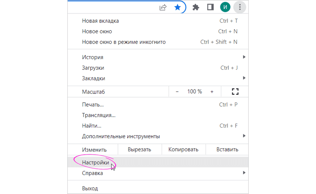Значок «Колокольчик» в Google Chrome - Если в адресной строке нет колокольчика, перейдите в настройки Google Chrome. Нажмите на значок меню — три вертикальные точки в правом верхнем углу экрана — и выберите пункт «Настройки».