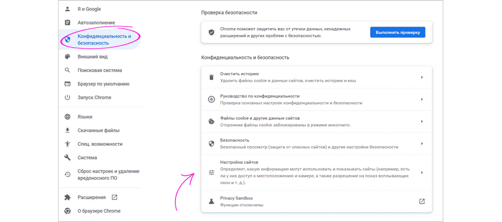 Значок «Меню» и настройки в Google Chrome - В колонке слева нажмите на «Конфиденциальность и безопасность», далее в поле посередине выберите «Настройки сайтов».