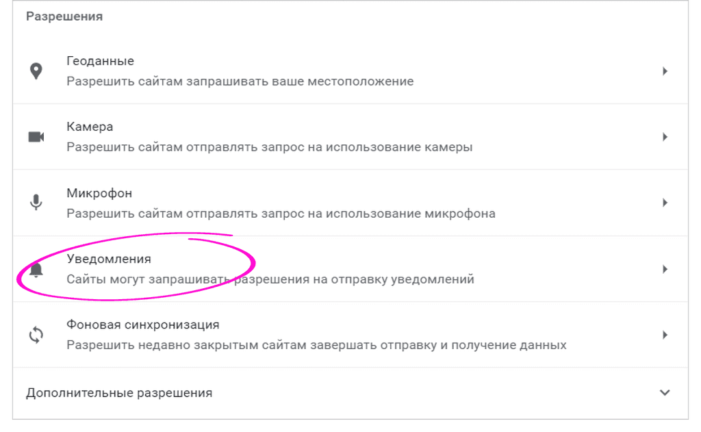 Настройки сайтов в разделе «Конфиденциальность и безопасность» - В разделе «Разрешения» выберите пункт «Уведомления».