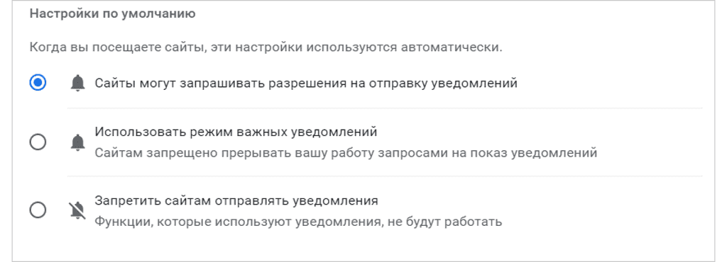 Настройка уведомлений - Откроется окно дополнительных настроек. Убедитесь, что вариант «Сайты могут запрашивать разрешения на отправку уведомлений» включён.