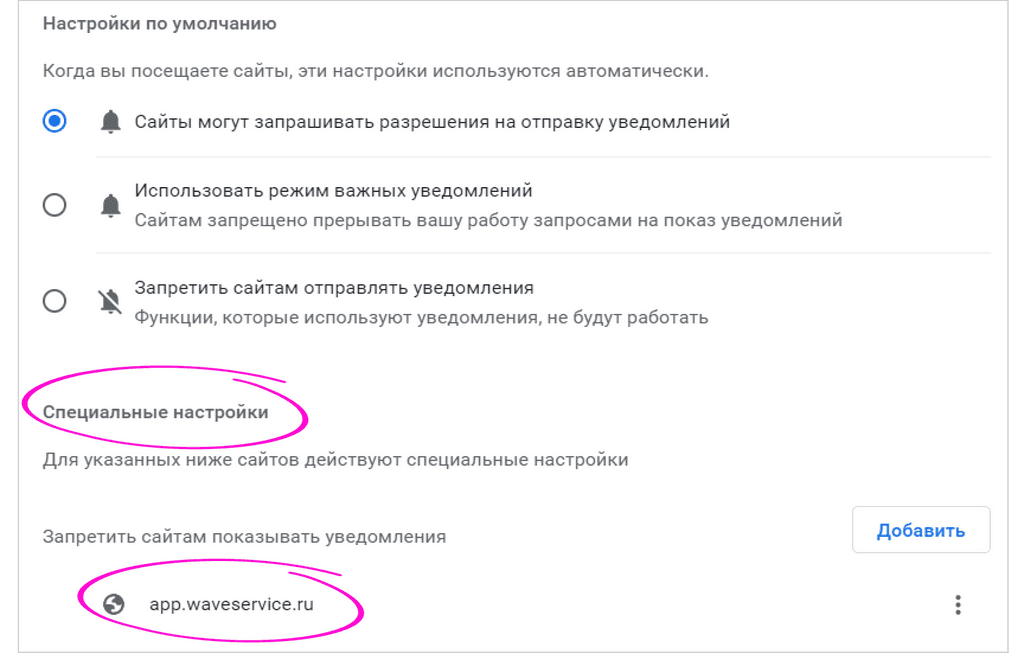 - В разделе специальных настроек найдите блок «Запретить сайтам показывать уведомления» и проверьте, есть ли там адрес app.waveservice.ru.