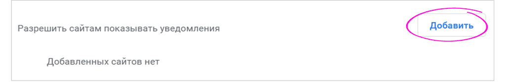 Опция «Разрешить» в выпадающем списке - Если нужного сайта нет в списке запрещённых, просто нажмите на кнопку «Добавить» в разделе «Разрешить сайтам показывать уведомления».