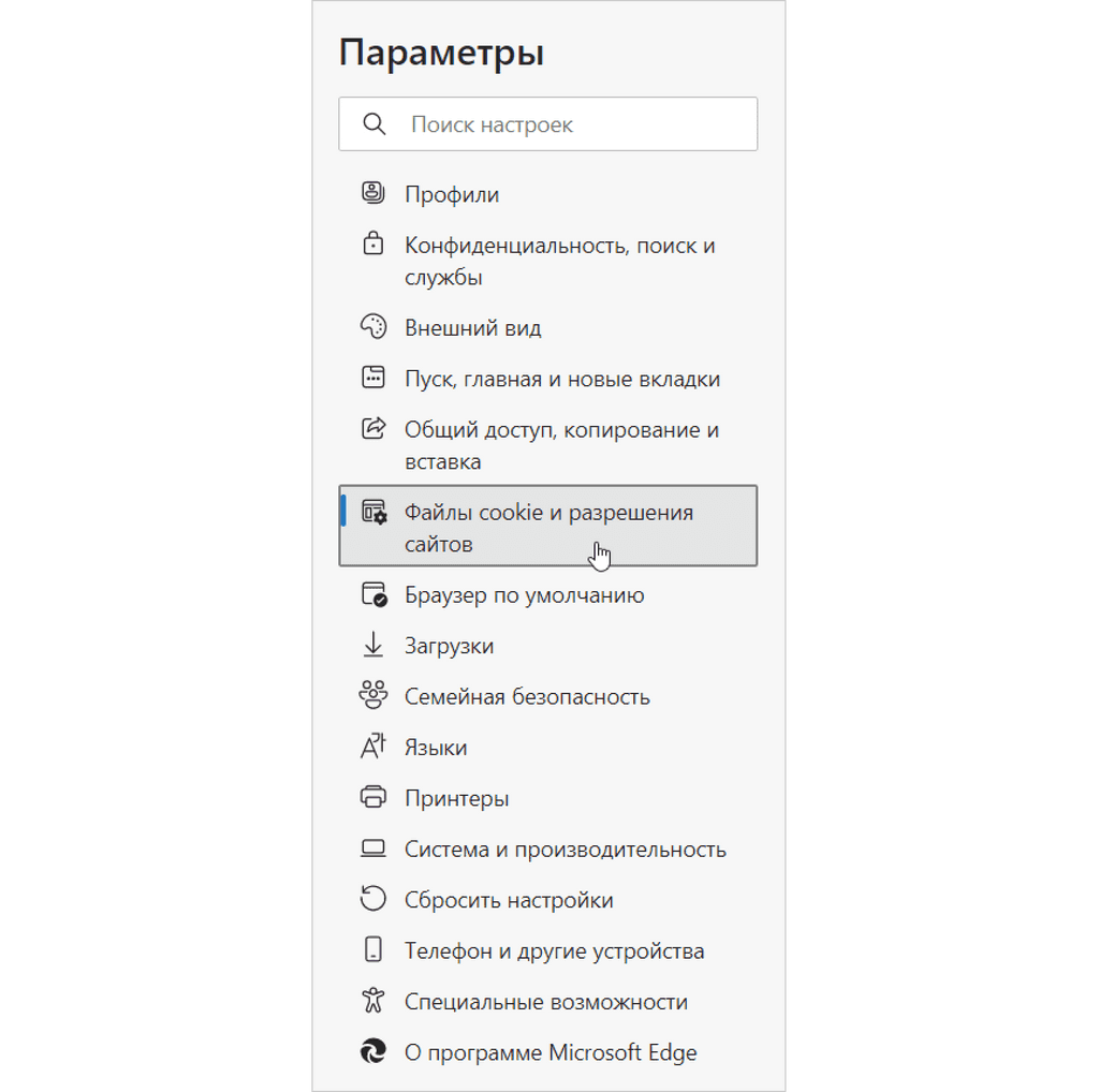 Секция «Файлы cookie и разрешения сайтов» в разделе «Параметры» -