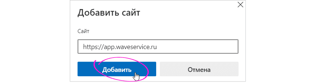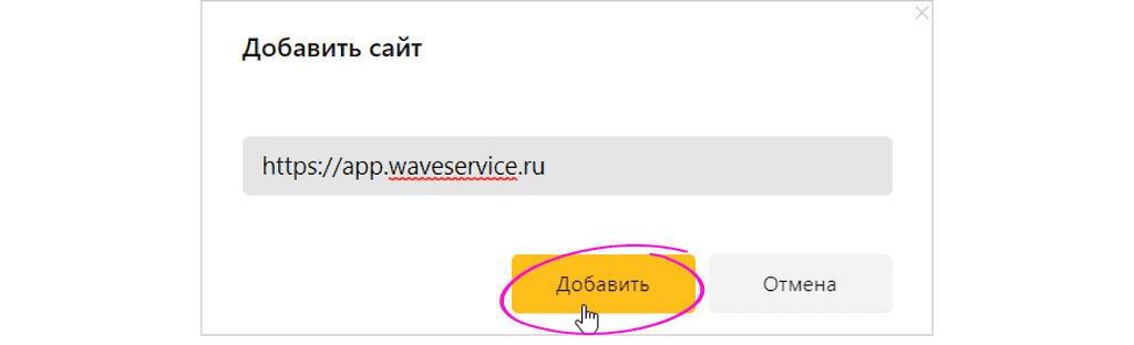 Кнопка «Добавить» - Скопируйте адрес https://app.waveservice.ru и вставьте в поле ввода. Нажмите «Добавить».