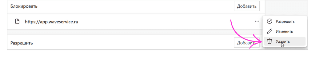 Кнопка «Добавить»Если адрес сайта находится в разделе «Блокировать», нажмите на значок меню (три горизонтальные точки). Затем в выпадающем списке кликните «Удалить».