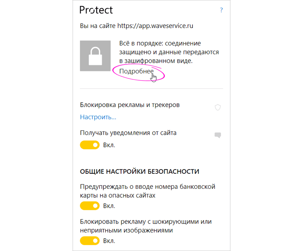 Значок «Замок» в Яндекс Браузере - В разделе «Protect» нажмите «Подробнее».