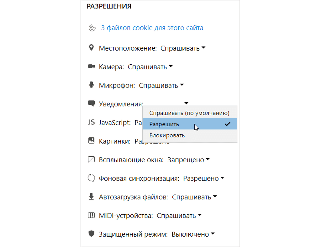 Подробные настройки в Яндекс Браузере - Пролистайте меню до раздела «Разрешения». Найдите пункт «Уведомления» и откройте выпадающий список (нажмите на треугольник справа от пункта). Выберите «Разрешить».