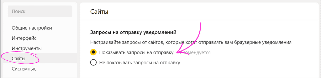 Настройки уведомлений через кнопку «Меню» в Яндекс Браузере - Далее в левой колонке выберите «Сайты». Убедитесь, что функция «Показывать запросы на отправку» активна.