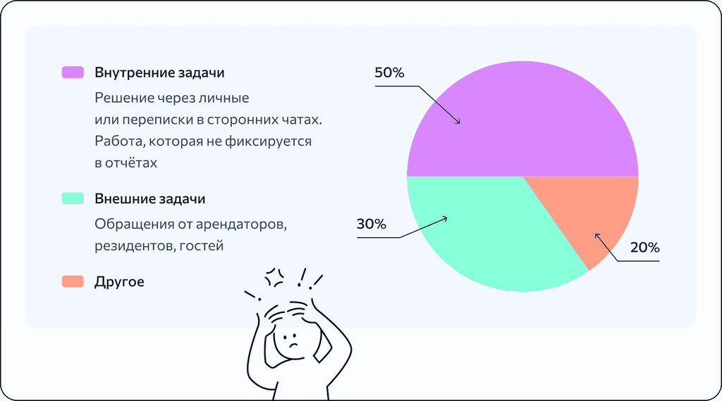 Например, обращения от арендаторов, резидентов или посетителей. Формула простая: «Есть заявка в системе, мы её через систему и решаем». Такие заявки составляют примерно 30% от общего количества всех рабочих задач обслуживающего персонала.