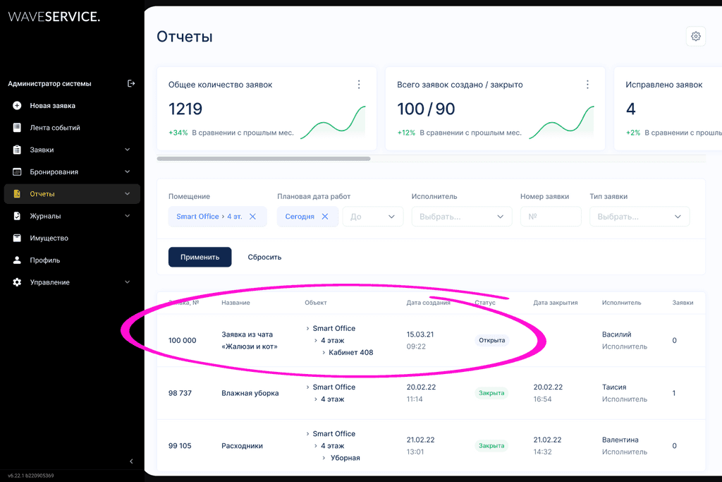 Весь процесс от создания заявки до оценки работы фиксируется системой и попадает в отчёты.