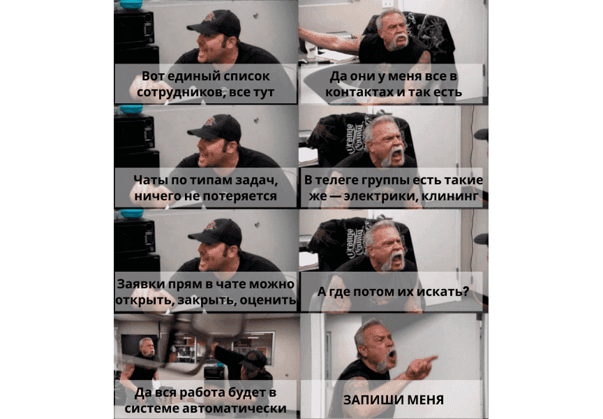 - Есть хаотичные чаты в WhatsApp* или Telegram, где состоят какие-то сотрудники. Например, специалисты по ремонту, менеджеры по клинингу, грузчики и электрики.