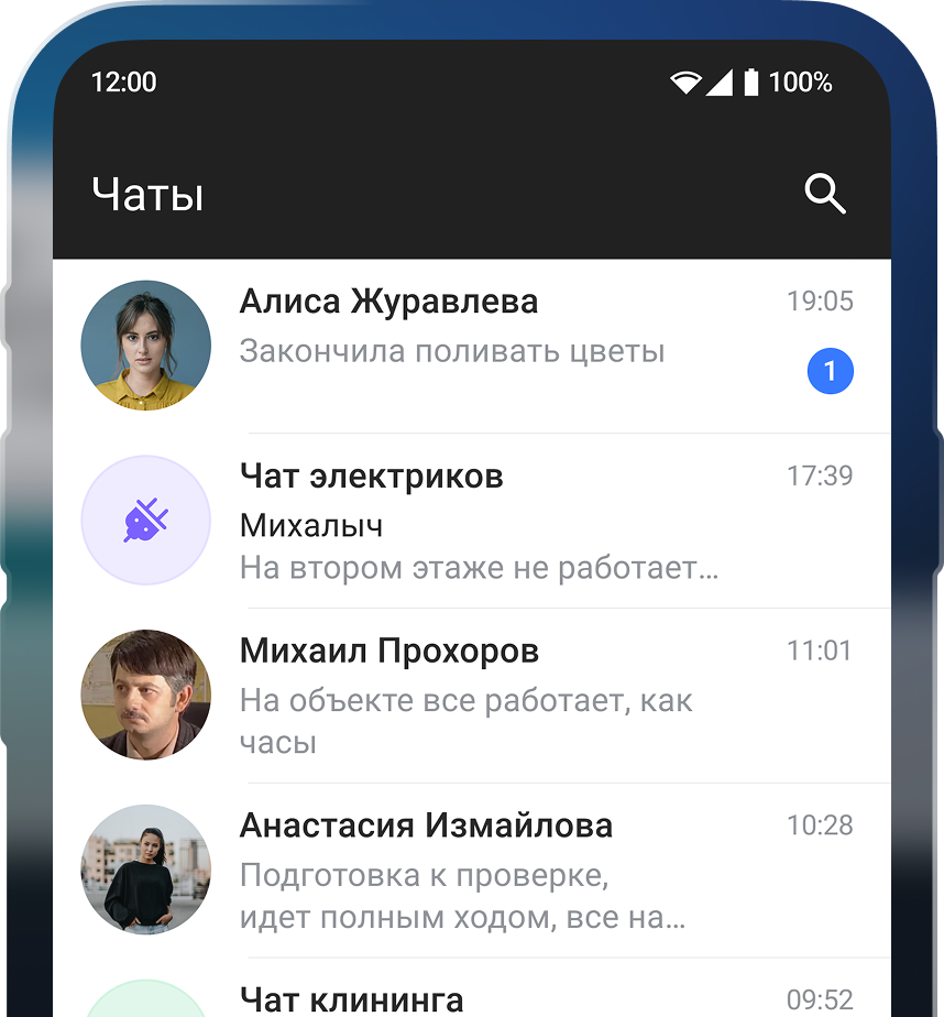 Вы создаёте чаты так же, как привыкли — по задачам, объектам или направлениям: клининг, техника, охрана. Вся коммуникация остаётся внутри системы и всегда доступна под рукой.